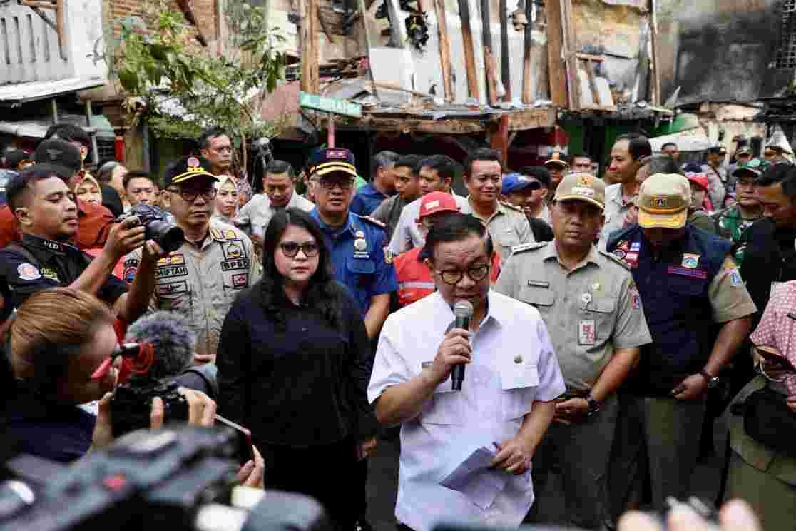 Gubernur DKI Jakarta, Pramono Anung, didampingi Wali Kota Jakarta Barat, Uus Kuswanto, meninjau lokasi kebakaran di Kelurahan Tangki, Tamansari, Jakarta Barat, pada Selasa (30/9).