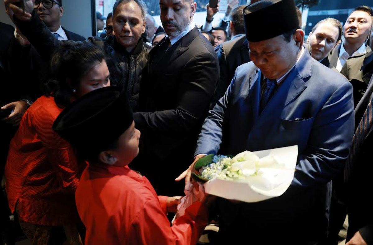 Prabowo disambut riuh semarak antusias para diaspora yang siap menyambut kedatangan Prabowo di hotel tempatnya menginap. Prabowo yang tiba mengenakan setelan jas biru tua dan peci hitam itu pun menyempatkan untuk memberikan tanda tangan, bersalaman serta berfoto bersama dengan para diaspora.