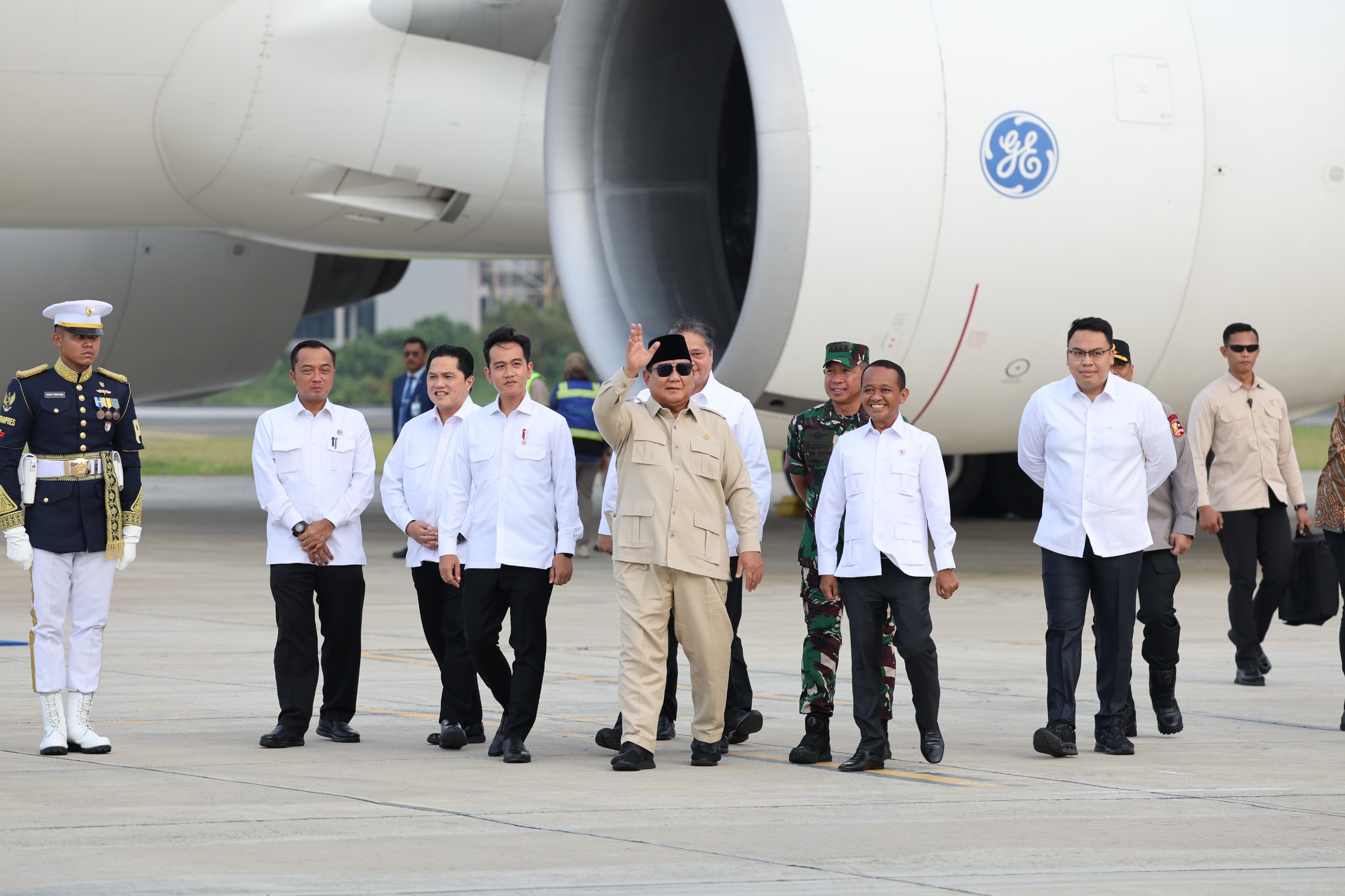 Presiden, Prabowo tiba di Lanud Halim Perdanakusuma sekitar pukul 15.40 WIB. Prabowo disambut oleh Wakil Presiden (Wapres) Gibran Rakabuming Raka, Menpora Erick Thohir, Kepala Badan Komunikasi Pemerintah Angga Raka Prabowo, dan Mensesneg Prasetyo Hadi. Selain itu, ada juga Menteri Koordinator bidang Perekonomian Airlangga Hartarto, Menteri ESDM Bahlil Lahadalia, dan Panglima TNI Jenderal Agus Subiyanto.