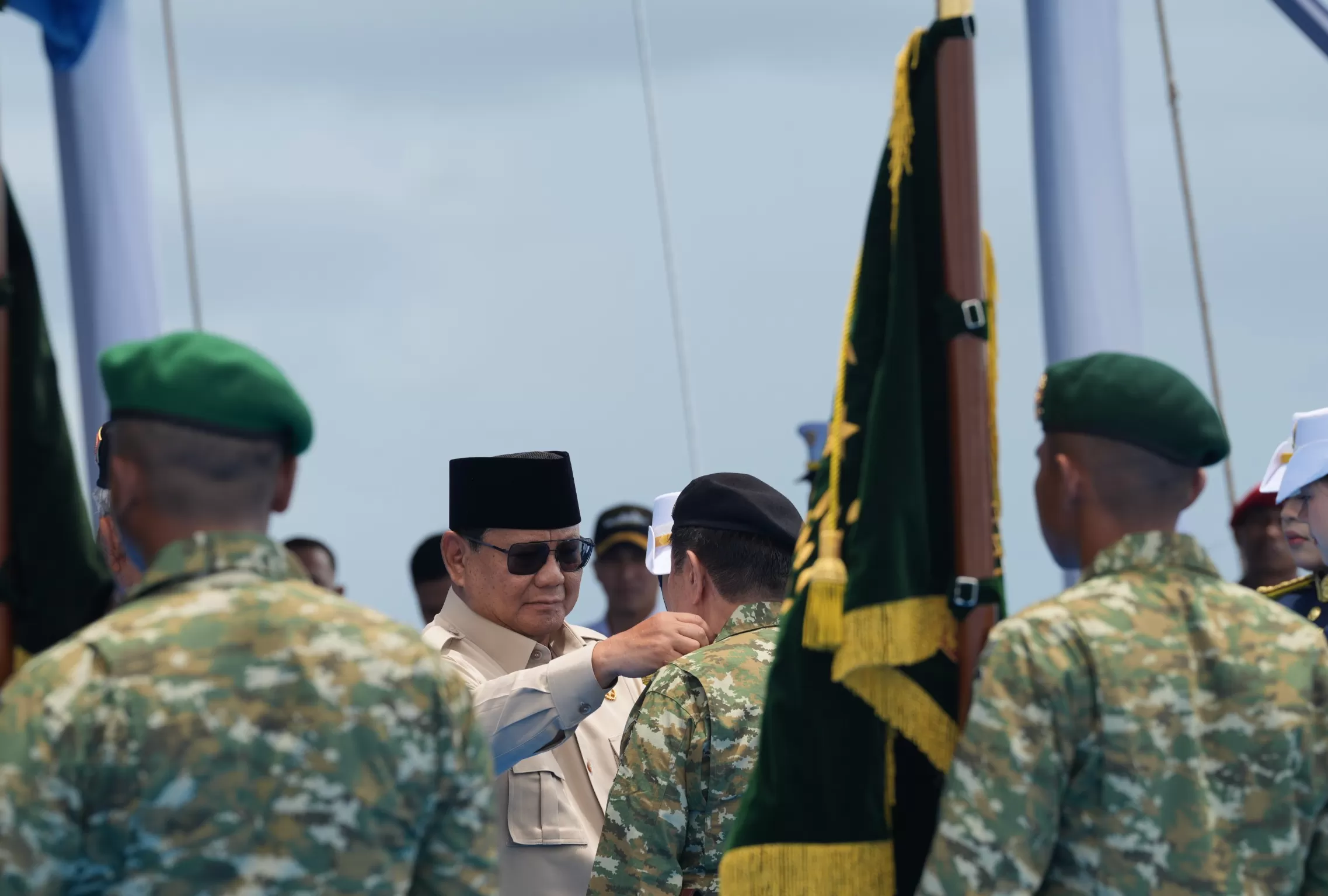Presiden RI Prabowo Subianto memimpin inspeksi “Presidential Inspection” armada TNI AL dalam rangka menyambut Hari Ulang Tahun ke-80 Tentara Nasional Indonesia (TNI) di wilayah perairan Teluk Jakarta, Rabu (2/10). Prabowo menyaksikan secara langsung kekuatan maritim TNI Angkatan Laut yang ditampilkan dalam Sailing Pass puluhan kapal perang di atas Kapal Markas KRI dr. Radjiman Wedyodiningrat-992.