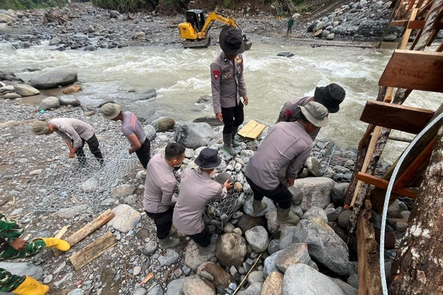 Personel TNI dan Polri bahu-membahu membangun jembatan darurat di Nagari Malalak Selatan, Kecamatan Malalak, Kabupaten Agam, Sumatera Barat. Pembangunan jembatan ini untuk menyambung akses warga, khususnya di Nagari Malalak Selatan yang terisolasi karena jembatan sebelumnya hancur akibat banjir bandang.