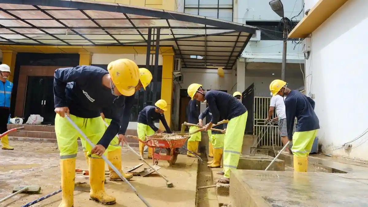 Relawan dari Tentara Nasional Indonesia (TNI), pegawai Perusahaan Listrik Negara (PLN), dan masyarakat bergotong royong membersihkan area rumah sakit. Pembersihan dilakukan secara menyeluruh, mencakup halaman, lorong bangunan, hingga fasilitas umum dan peralatan medis. Tempat tidur pasien, meja, dan kursi dibersihkan agar rumah sakit dapat kembali berfungsi. Alat berat seperti ekskavator juga dikerahkan untuk mempercepat pengangkatan lumpur dan material sisa banjir.