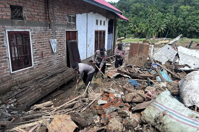 Pada Sabtu (27/12), Polda Sumbar mengerahkan personel Satuan Brigade Mobil (Satbrimob) untuk membersihkan rumah-rumah warga yang tergenang lumpur di Kampung Tangah Kecamatan Palembayan, Kabupaten Agam.