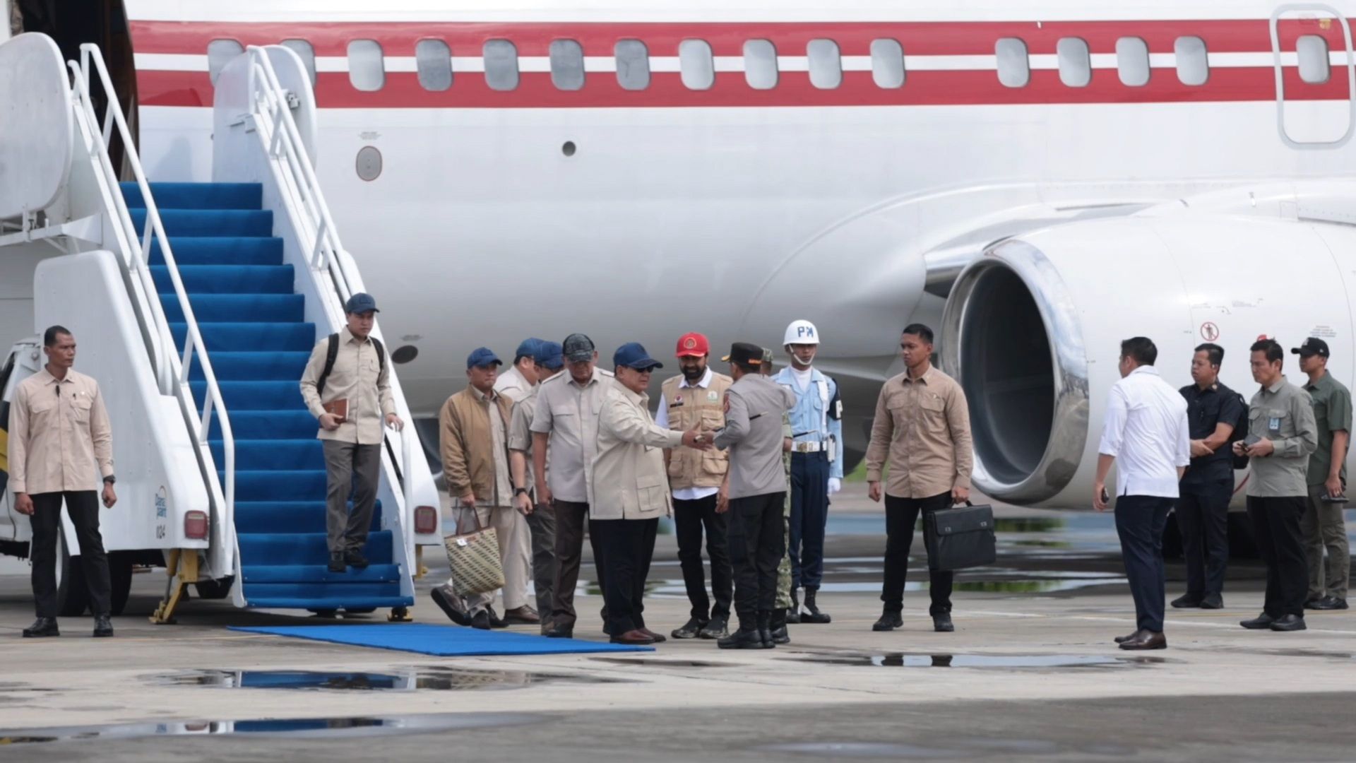 Presiden RI Prabowo Subianto tiba di Lanud Sultan Iskandar Muda pada pukul 10.20 WIB untuk melakukan peninjauan langsung kedua kalinya terhadap perkembangan penanganan bencana alam yang melanda sejumlah wilayah Aceh, Minggu kemarin.