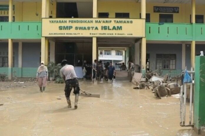 Para prajurit TNI bahu-membahu mengangkat lumpur, menyemprot ruang kelas dengan air bersih, serta membersihkan lingkungan sekolah. Lumpur tebal yang mengendap di lantai, meja belajar, hingga dinding kelas dibersihkan meski dengan peralatan seadanya. Kehadiran TNI di lokasi tidak hanya membantu secara fisik, tetapi juga menjadi penyemangat bagi para guru, siswa, dan warga.