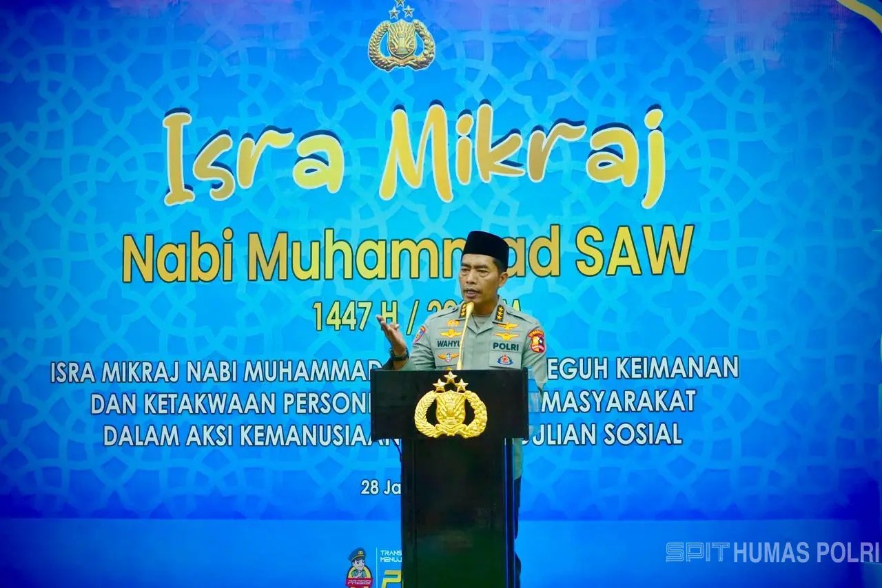 Markas Besar Kepolisian Negara Republik Indonesia menggelar peringatan Isra Mikraj Nabi Besar Muhammad SAW 1447 Hijriyah di Masjid Al-Ikhlas Mabes Polri, Jakarta Selatan. Kegiatan ini menjadi bagian dari pembinaan rohani internal institusi kepolisian. Tema yang diangkat menekankan penguatan keimanan dan ketakwaan personel Polri. Pendekatan tersebut diarahkan agar pengabdian kepada masyarakat tetap berlandaskan nilai kemanusiaan dan kepedulian sosial.