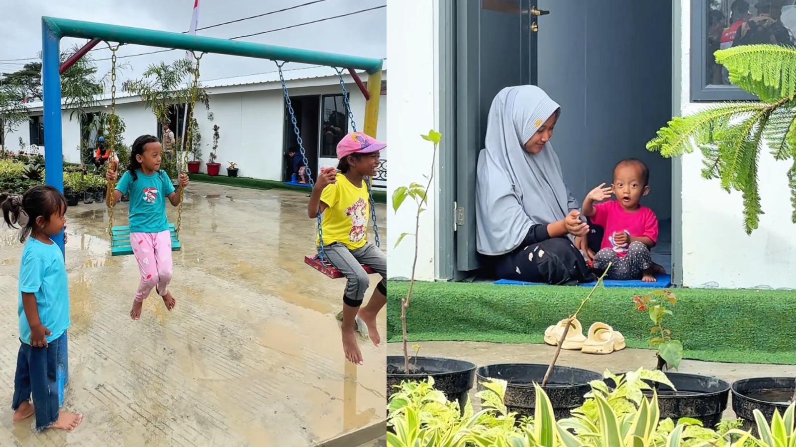 Pemandangan ceria mendominasi kompleks hunian berderet rapi tersebut sore hari ini. Anak-anak berlarian bermain ayunan di taman terbuka, melompat di kasur bersih, dan menikmati ruang bebas yang tak ada saat tinggal di tenda darurat. Orang tua duduk santai di kursi taman depan unit, mengawasi buah hati mereka dengan wajah penuh harap.