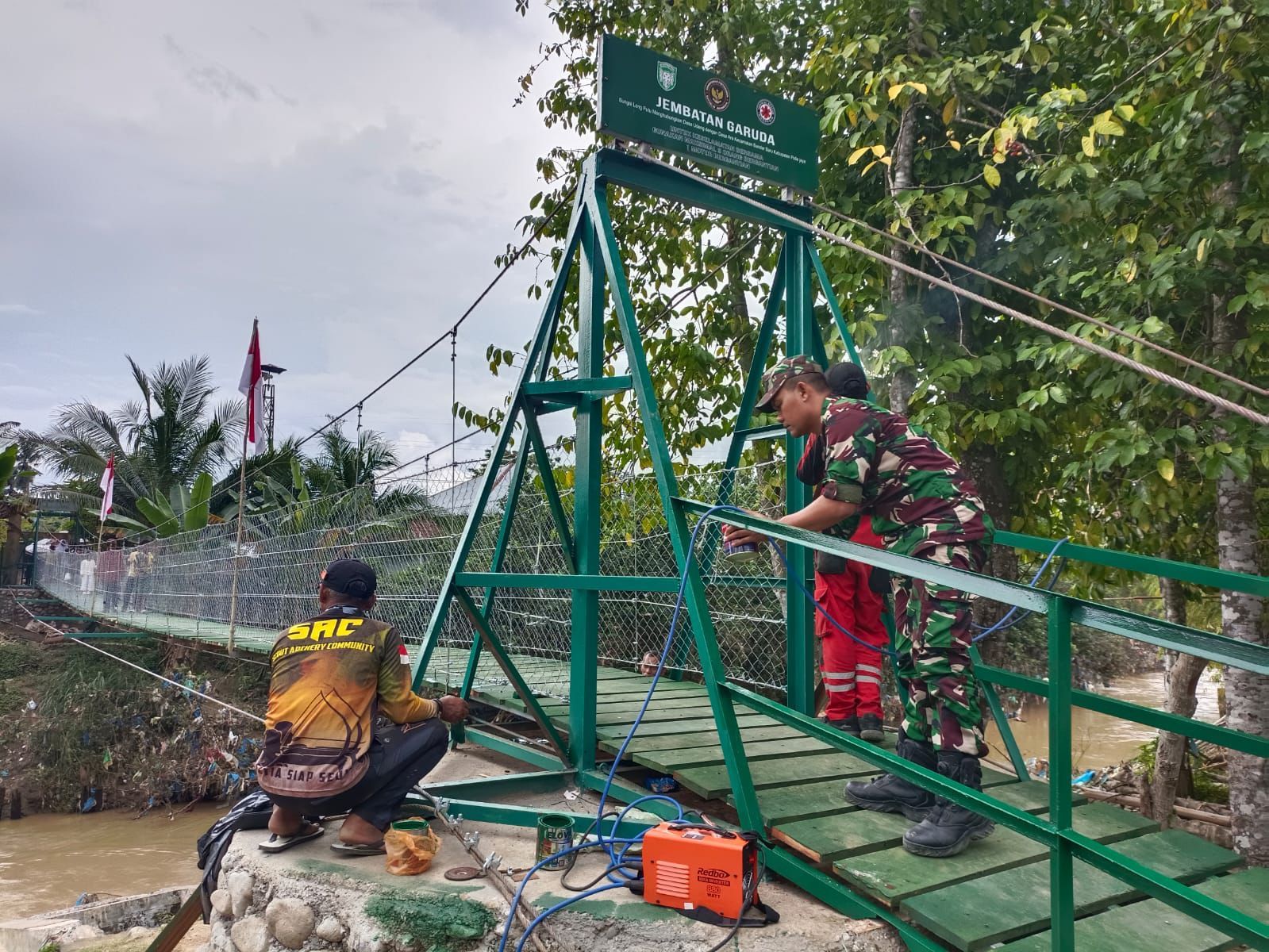 Sling-sling besi juga telah terbentang sebagai rangka utama jembatan. Selanjutnya, pijakan akan dipasang agar jembatan gantung sepanjang 120 meter itu dapat segera difungsikan dalam waktu dekat.