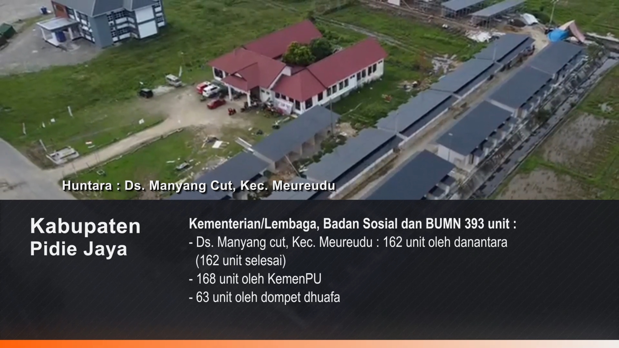 Adapun di Kabupaten Aceh Tamiang, total pembangunan huntara mencapai 1.950 unit yang terdiri atas huntara insitu dan terpusat. Sebagian unit telah selesai, sementara pembangunan tahap pertama oleh kementerian dan pihak swasta juga masih berlangsung di sejumlah desa.