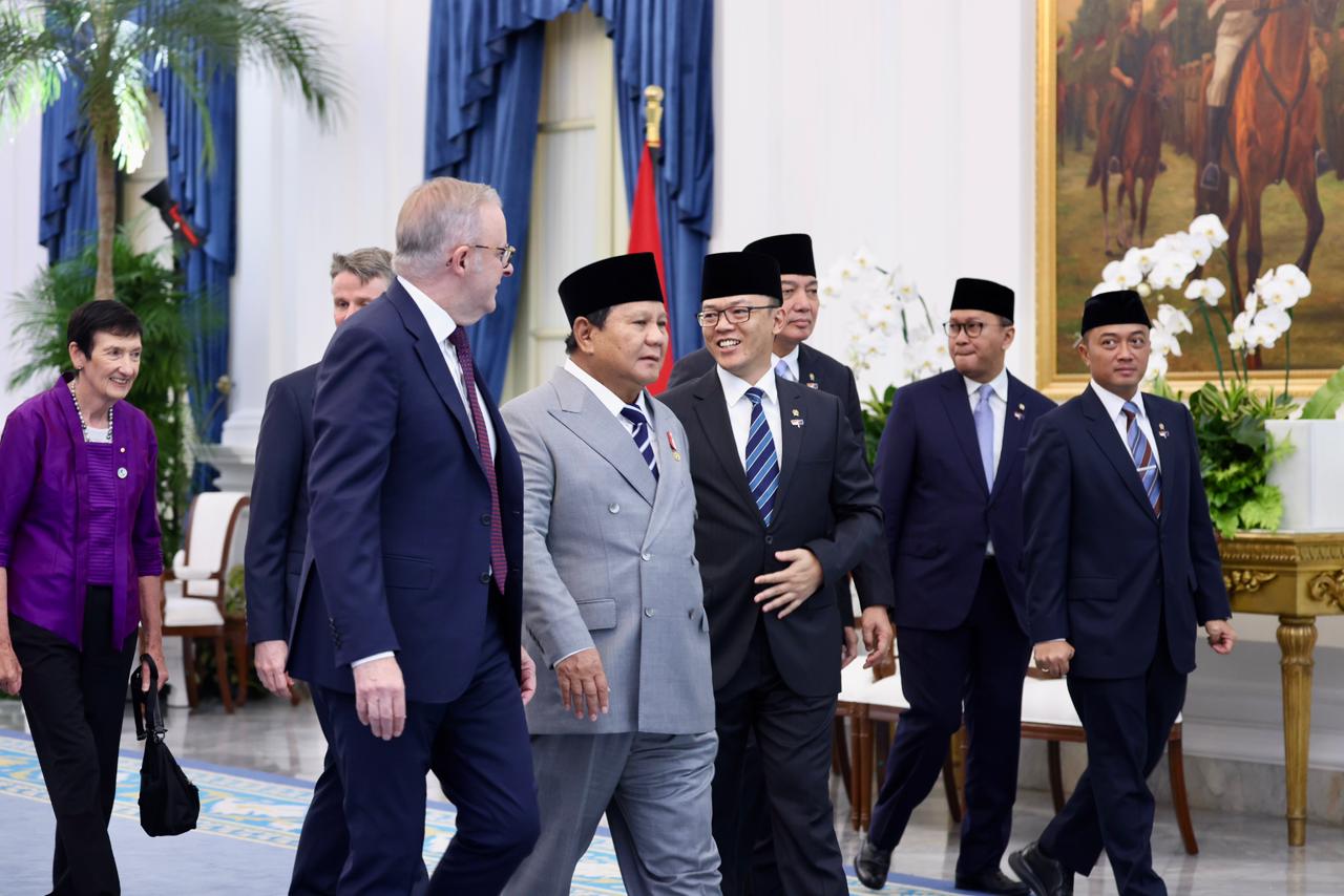 Presiden Republik Indonesia, Prabowo Subianto, menjajaki penguatan kerja sama di berbagai bidang bersama Perdana Menteri Australia Anthony Albanese di Istana Merdeka, Jakarta, Jumat (6/2). Kerja sama tersebut dimulai dari penguatan sistem pendidikan Indonesia dengan Australia melalui program pelatihan dan peningkatan kapasitas bagi guru dan tenaga pengajar.
