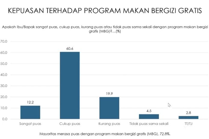 Survei terbaru Indikator Politik Indonesia menunjukkan tingkat kepuasan masyarakat terhadap program Makan Bergizi Gratis (MBG) mencapai 72,8 persen. Capaian tersebut menjadi indikator positif penerimaan publik terhadap salah satu program unggulan pemerintahan Presiden RI Prabowo Subianto.