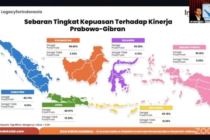 Direktur Indekstat, Ali Mahmudin, menjelaskan, jika dilihat berdasarkan regional pulau, tiga dari lima kawasan menunjukkan tingkat kepuasan yang sangat tinggi. Kalimantan menempati posisi tertinggi dengan 96,66 persen, disusul Sulawesi 95,28 persen, dan Maluku-Papua 93,16 persen. Sementara Jawa di angka 88,97 persen dan Sumatera 86,72 persen.