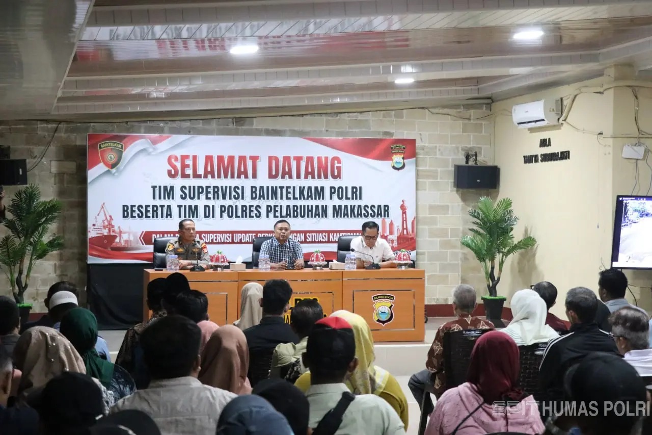 Tim Supervisi Biro Pengendalian Internal Mabes Polri melakukan kunjungan kerja ke Markas Komando Polres Pelabuhan Makassar dalam rangka monitoring dan evaluasi situasi keamanan dan ketertiban masyarakat. Kegiatan yang dipimpin Brigadir Jenderal Polisi Asep ini merupakan bagian dari upaya strategis Kepolisian Negara Republik Indonesia untuk memastikan stabilitas kamtibmas tetap terjaga. Selain itu, kunjungan ini juga bertujuan memperkuat sinergi antara kepolisian dan masyarakat. Pelaksanaan kegiatan berlangsung di ruang Vicon Aula Polres Pelabuhan Makassar.