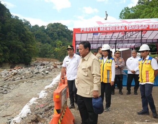 Presiden RI Prabowo Subianto melanjutkan peninjauan langsung ke Kabupaten Padang Pariaman, Sumatera Barat, Kamis (18/12). Ia mengecek Jembatan Padang Mantuang (jembatan bailey) yang