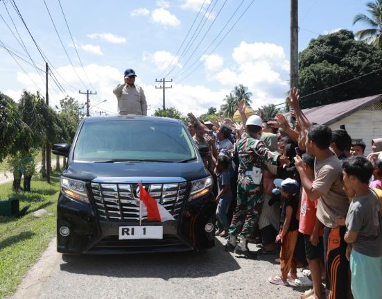 Presiden RI Prabowo Subianto menghentikan laju mobil kepresidenan saat dalam perjalanan menuju lokasi pembangunan jembatan bailey di Sungai Garoga, Batang Toru, Tapanuli Selatan,