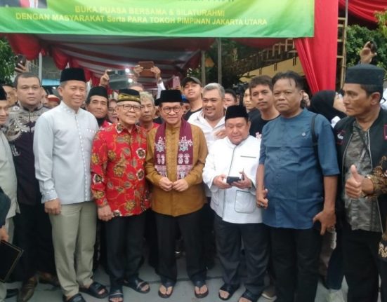 Gubernur Pramono Anung menghadiri kegiatan buka puasa bersama (iftar) dengan warga di Masjid Raya Al Husna, Tanjung Priok, Jakarta Utara, Kamis (12/3). Dalam