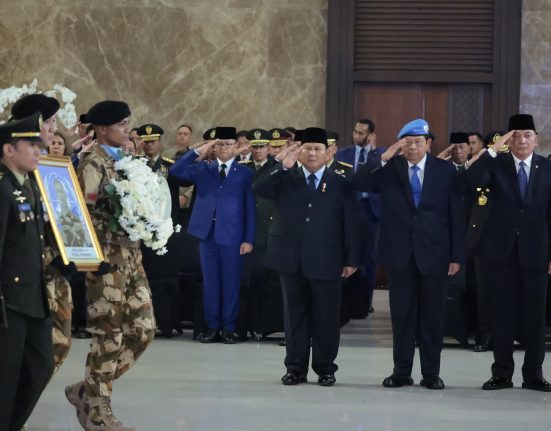 Presiden Prabowo Subianto memberikan penghormatan terakhir kepada tiga prajurit TNI yang gugur saat menjalankan misi perdamaian di Lebanon, di Bandara Internasional Soekarno-Hatta International