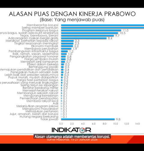 Pemberantasan Korupsi Jadi Alasan Utama Kepuasan Publik terhadap Kinerja Prabowo