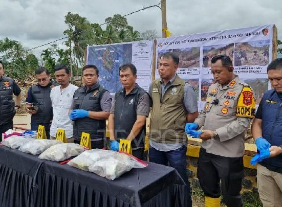 Kementerian Kehutanan bersama Bareskrim Polri memaparkan temuan awal hasil identifikasi forensik terhadap kayu gelondongan yang terbawa banjir bandang di Garoga, Batangtoru, Tapanuli Selatan,.
