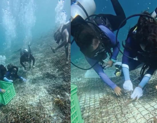 Utusan Khusus Presiden (UKP) Bidang Pariwisata, Zita Anjani, melakukan penanaman terumbu karang di perairan Yenbekwan, Raja Ampat (20/12). Aksi bersama komunitas The Sea.