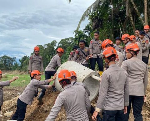 Anggota Brimob Gotong Royong Perbaiki Jalan dan Gorong-Gorong di Kabupaten Agam