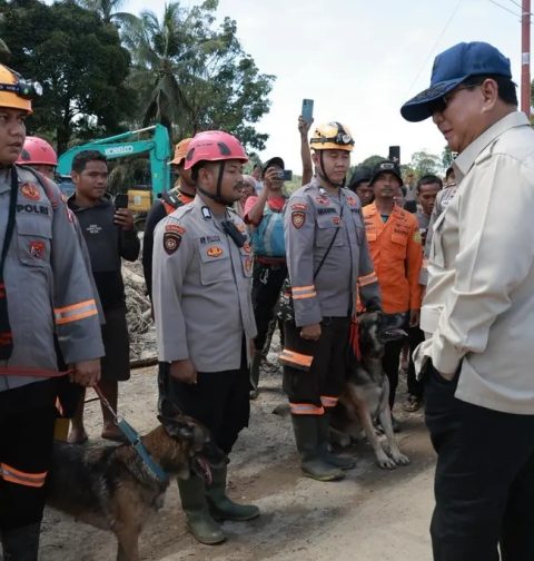 Prabowo Sapa Petugas K-9 Saat Tinjau Pembangunan Jembatan Bailey di Tapanuli Selatan