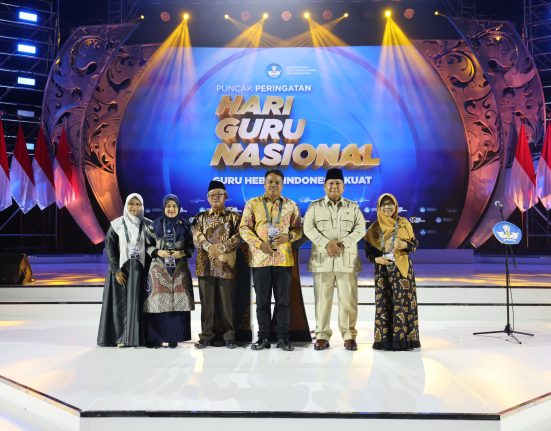 Presiden Republik Indonesia, Prabowo Subianto, menganugerahkan penghargaan kepada tiga pengajar berprestasi pada Puncak Peringatan Hari Guru Nasional (HGN) 2025 di.